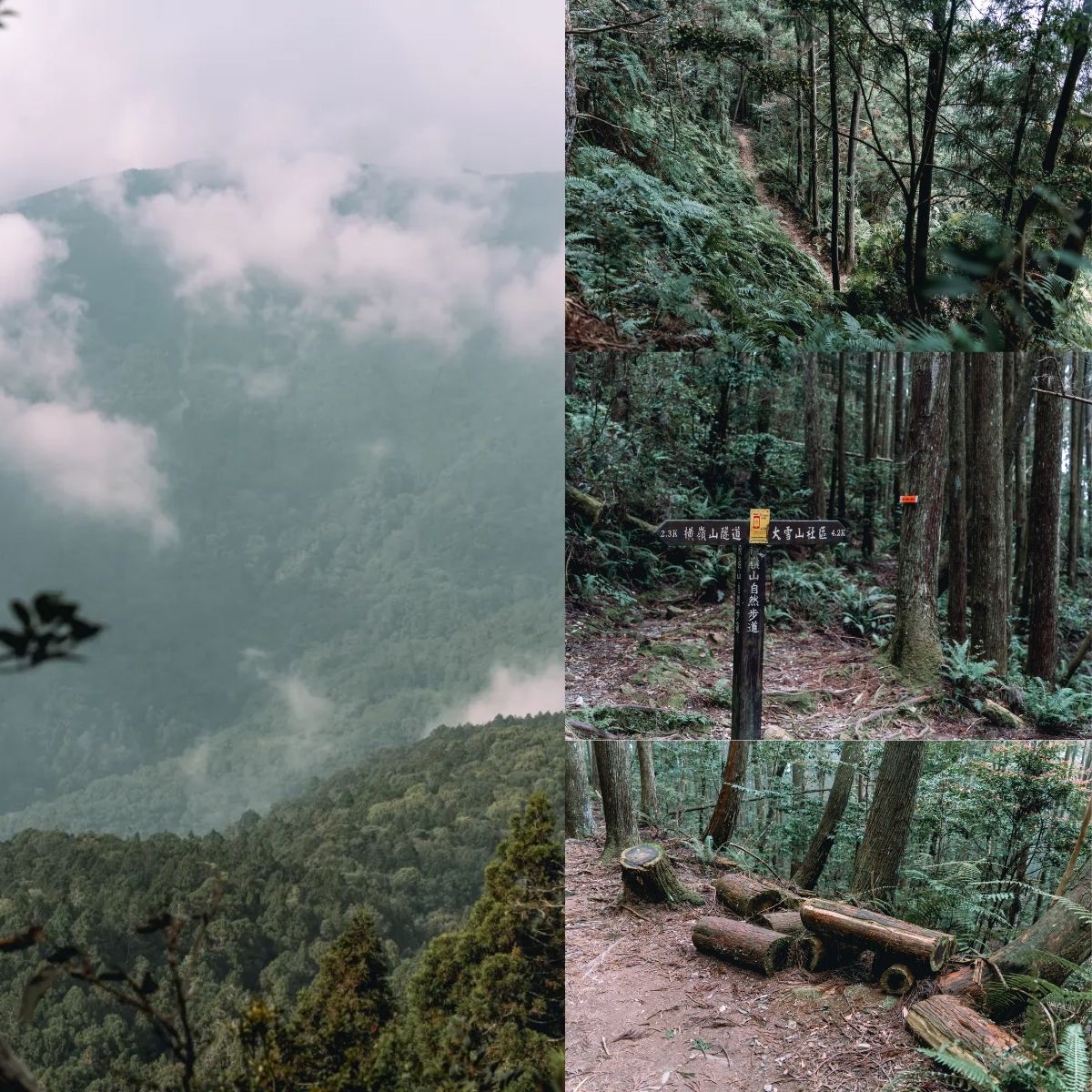 從大雪山林道 26.5K 橫嶺山隧道口出發,車輛可停放於林道邊的白線處。橫嶺山自然步道全長 6.6 公里,前半段路徑平緩,林相多為杜鵑與柳杉混林,空氣中帶有淡淡木質香氣。這條步道前身是日治時期居民運送木材的木馬道,如今留下的是一條兼具歷史與自然的森林小徑。