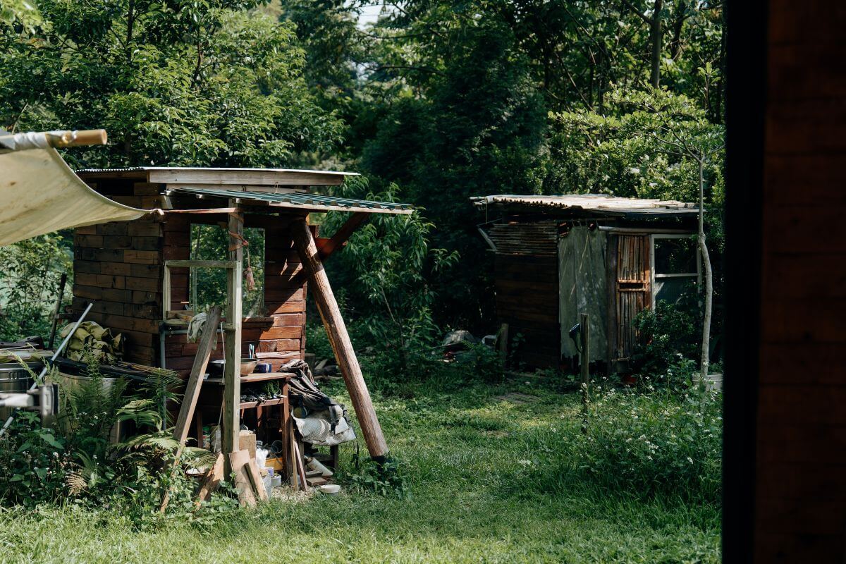 ▲左邊為木屋外的廁所,洪川會在洗手台上放臉盆收集洗手剩下的水拿去沖馬桶。右邊為浴室,也是利用剩餘的木材邊料搭建而成。