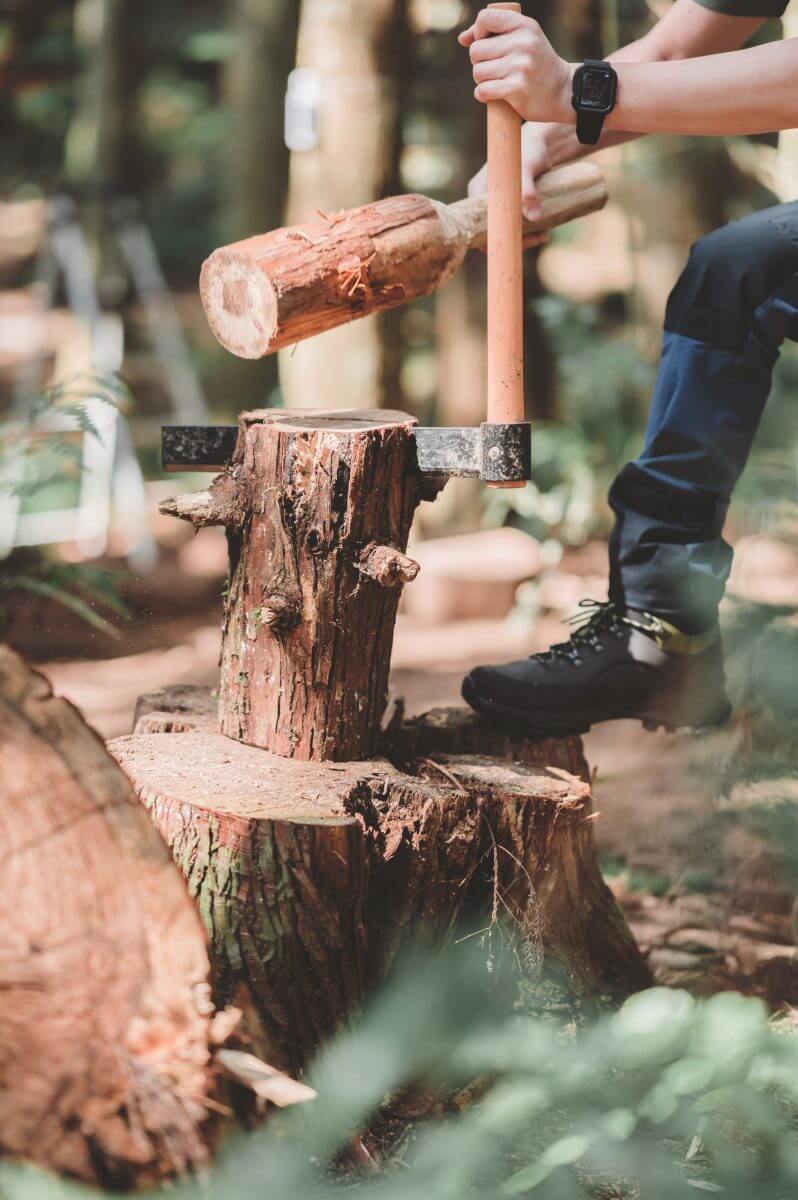 <惜木的他,就連砍下來剩餘的木頭,都會做成木作工具。圖中是他自製的「杉木槌」,用以協助劈木。NK 在作業時,習慣穿著 Fjällräven 服飾,因為耐磨、彈性、透氣等特性,適合在戶外工作的他。圖中上衣為 Abisko Wool Classic SS M,採用美麗諾羊毛與聚酯纖維以平紋針織混紡製成的輕量 T-shirt,天然抗臭;下身為 Keb Agile Trousers M,採用輕量尼龍彈性布料製成,在口袋、膝蓋和褲腳內側還以 G-1000 Lite Eco Stretch 布料局部加強耐磨。>